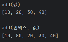 특정 위치에 추가하고 싶다면 메서드 add의 첫 번째 인자로 인덱스를 지정한다.