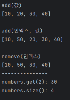 numbers.remove(2); //index 2에 있는 데이터를 삭제