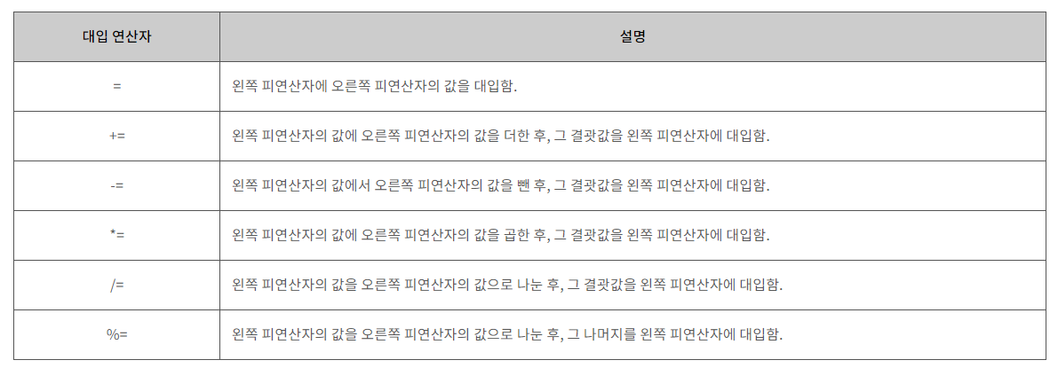 대입 연산자(assignment operator): 변수에 값을 대입할 때 사용하는 이항 연산자