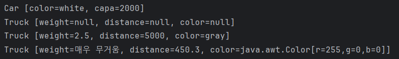 return "Truck [weight=" + weight + ", distance=" + distance + ", color=" + color + "]";
