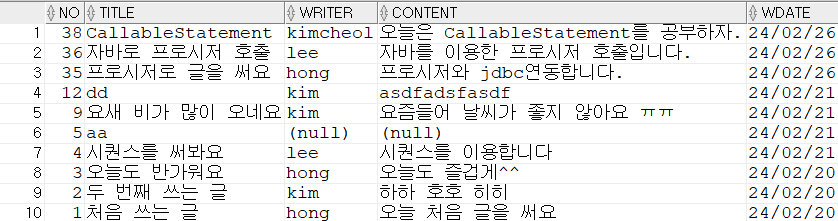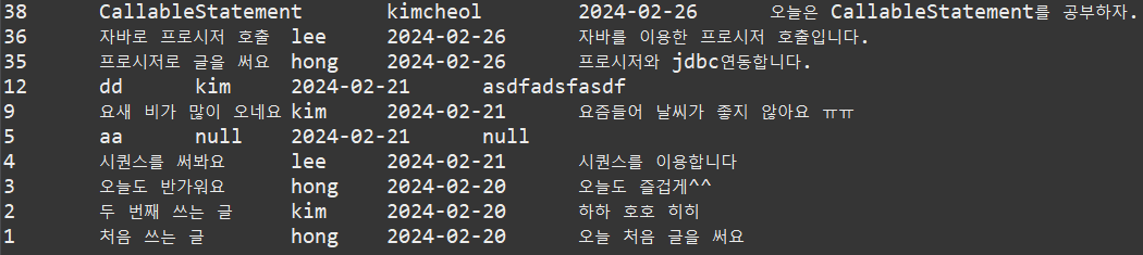 - bbs에 저장된 내용들을 자바에서 출력하는 프로시저를 만들자.