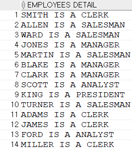 SELECT ename || ' IS A ' || job AS "EMPLOYEES DETAIL" FROM emp;