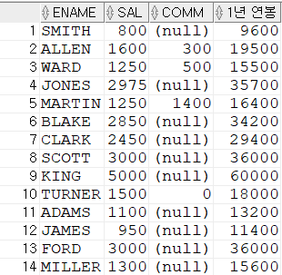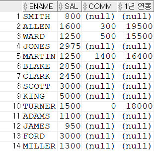 SELECT ename, sal, comm, (sal*12+comm) "1년 연봉" FROM emp;