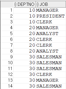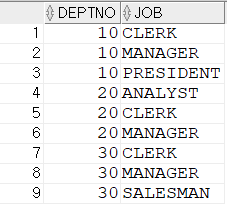 SELECT DISTINCT deptno, job FROM emp ORDER BY deptno ASC;