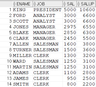 SELECT ename, job, sal, (sal+300)*2 salup FROM emp ORDER BY salup DESC; --AS 생략