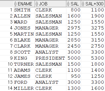 SELECT ename, job, sal, sal+300 FROM emp; --급여 인상(급여+300)