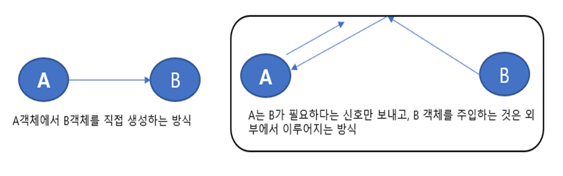 '의존성 주입(DI: Dependency Injection)' 방식을 사용하려면 오른쪽 그림의 바깥쪽 도형처럼 추가적인 하나의 존재가 필요하게 된다. 이 존재는 의존성이 필요한 객체에 필요한 객체를 찾아서 '주입'하는 역할을 하게 된다.