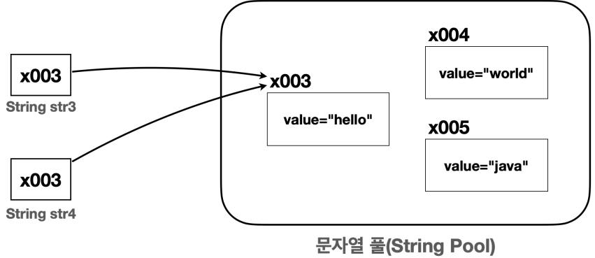 - String str3 = "hello"와 같이 문자열 리터럴을 사용하면 문자열 풀에서 "hello"라는 문자를 가진 String 인스턴스를 찾는다. 그리고 찾은 인스턴스의 참조(x003)를 반환한다.
