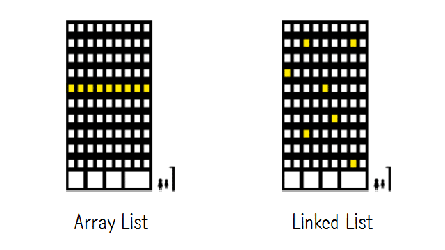첫 번째 회사는 모든 직원이 한곳에 모여있어야 한다는 철학이 있기 때문에 사무실이 모여있다. 배열은 건물을 이런 식으로 사용하는 것과 비슷하다. 만약 회사가 성장해서 사무실이 좁아지면 더 이상 새로운 직원을 뽑을 수 없다. 붙어있는 공간이 없기 때문이다. 만약 더 많은 공간이 필요하다면 더 많은 사람을 수용할 수 있는 공간을 찾아서 전체가 이사해야 한다.