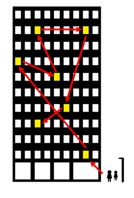 linked list는 한 건물 내에서 한 회사가 임대한 사무실이 서로 떨어져 있다. 덕분에 직원이 늘어도 큰 걱정이 없다. 건물에서 비어있는 곳 아무데나 임대해서 들어가면 된다. 그런데 방문자가 사무실을 찾는 방법이 좀 비효율적이다. 위의 그림에 있는 방문자가 3번째 사무실을 찾아가려면 우선 첫 번째 화살표의 사무실을 찾아가야 한다. 이 사무실의 직원에게 다음 사무실이 어딘지 물어본다. 그럼 알려주는 사무실로 이동 한 후에 다시 물어봐서 그 다음 사무실로 이동한다.