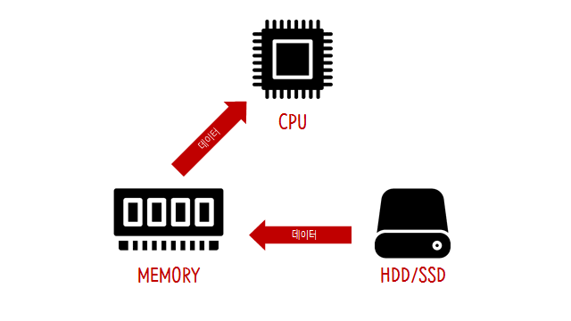 이런 이유로 데이터는 기본적으로 스토리지에 저장된다. 하지만 스토리지는 매우 느리기 때문에 CPU와 함께 일을 하기에는 속도면에서 부족하다. 그래서 어떤 프로그램을 실행하면 그 프로그램과 데이터는 메모리로 옮겨진다. CPU는 메모리에 로드된 데이터를 이용해서 여러가지 일을 하게 된다.