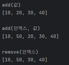 특정 위치에 추가하고 싶다면 메서드 add의 첫 번째 인자로 인덱스를 지정한다.